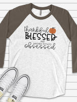 Fall & Thanksgiving Raglan, Thankful, Blessed and Mashed Potatoes Obsessed Design on premium Raglan 3/4 sleeve shirt, plus size, 2X, 3X