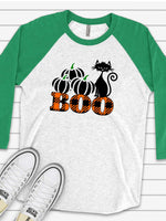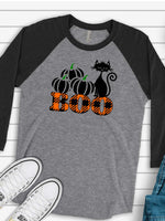 Halloween Raglan, Super Cute Black Cat on Orange Plaid Pumpkin BOO Design on premium Raglan 3/4 sleeve shirt, plus size, 2X, 3X