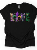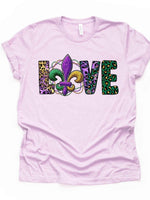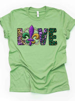 - Mardi Gras Gnome Tee, Animal Print LOVE with Fleur De Lis Design on premium unisex shirt, 3 color choices, 3x Mardi Gras, 4x Mardi Gras