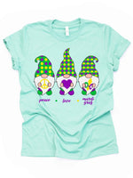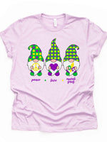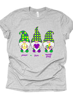 - Mardi Gras Gnome Tee, PEACE LOVE Mardi Gras with Beads Design on premium unisex shirt, 3 color choices, 2X, 3X, 4X, plus sizes available
