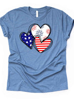 Patriotic Tee, 3 Patriotic Hearts with Stripes and Fireworks Design on premium unisex shirt, 3 color choices, 3x Patriotic, 4x Patriotic