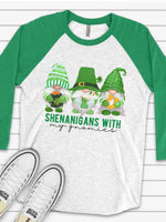 St. Patrick's Day Raglan, Shenanigans with My Gnomies, St Patrick Gnomes Design on premium Raglan 3/4 sleeve shirt, plus size, 2X, 3X